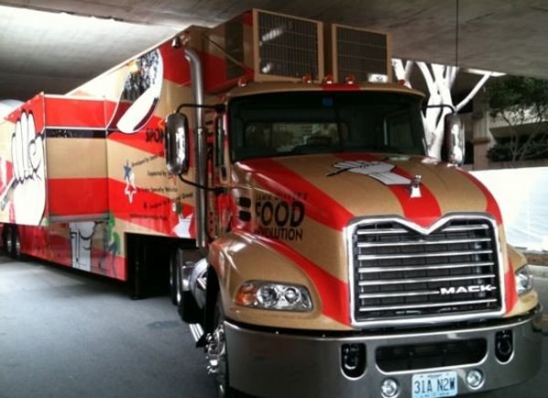 Unlike most of LA’s food trucks, which are typically the size of a UPS delivery truck, Oliver’s Food Revolution food truck is an 18-wheeler, capable of fitting up to 40 students at one time in its fully loaded kitchen that boasts eight separate kitchen stations, plasma TV screens and a stage.