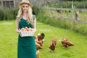 Photo of woman with chickens and eggs via Shutterstock