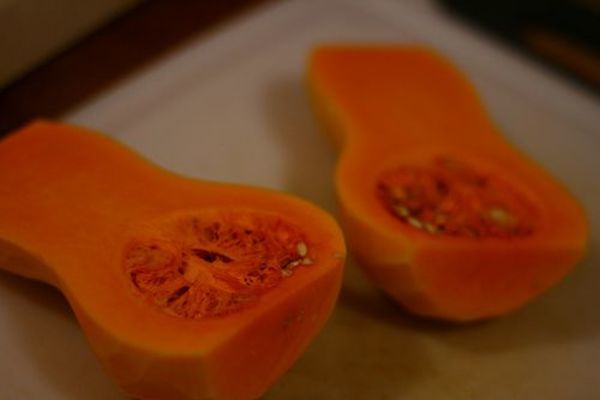 Though usually prepared by removing the skin, stalk and seeds, keep in mind that the seeds are edible – either raw or roasted – and the skin too, as it softens when roasted. One of the most common ways to prepare butternut squash is roasting, as it concentrates the sweetness in the flesh. To do this, the squash is cut in half lengthwise (use those muscles!), lightly brushed with a cooking fat of your choice (check out our Oil Manifesto), and placed cut side down on a baking sheet. Generally, it needs to bake for about 45 minutes or until it is softened. It can be puréed (to make a soup) or mashed, thrown into casseroles, breads and muffins. Cubing your squash (when raw) and adding it to a roasted vegetable array is easy, healthy and a winning choice.