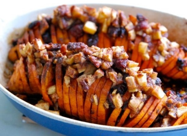 Instead of Candied ‘Yams’, give this one a go: Hassleback Sweet Potatoes! A Hasselback potato is one that’s thinly sliced, topped with bread crumbs and herbs, and then roasted. And My Recession Kitchen gives it an apt adaptation with a Thanksgiving favorite, the sweet potato.