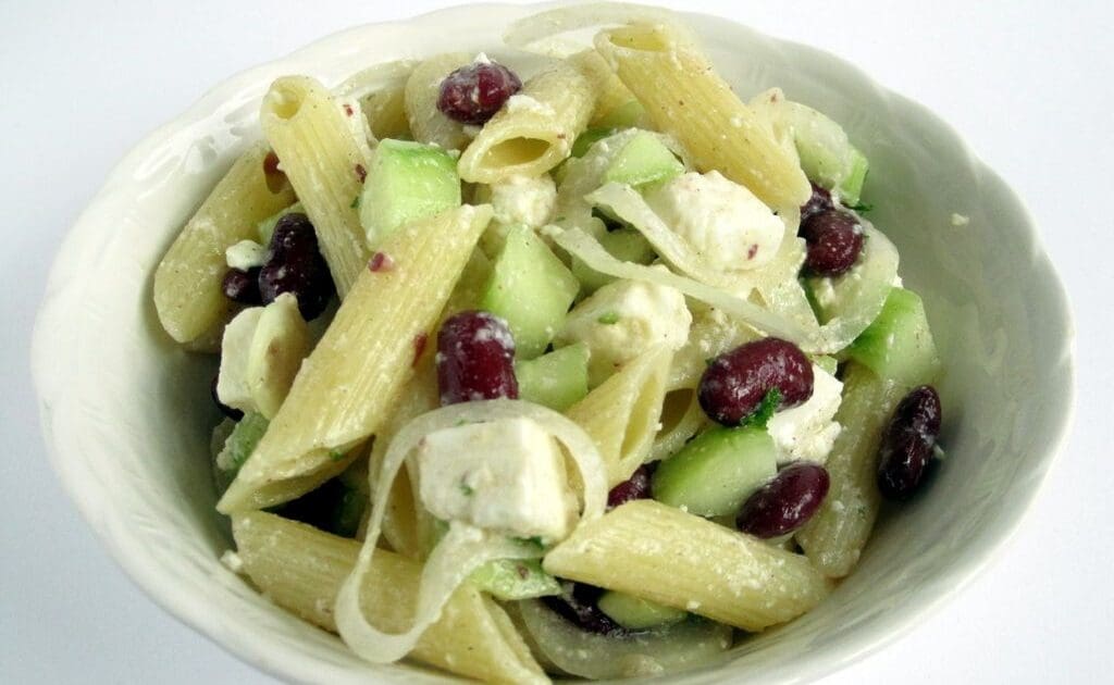 This first choice is a yummy, summery pasta salad. The base recipe includes chickpeas, cucumber and dill, but you can change up the chickpeas for black beans or kidney beans, depending on what you have on-hand, and add tomatoes, onions and other herbs for variations on a theme.