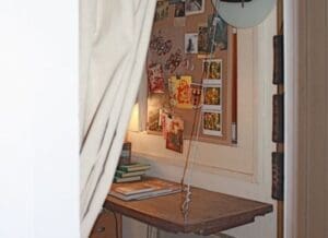 If doors are too much of a nuisance, hang curtains that you can open and close easily across the opening to your closet office. If you choose to leave the doors intact, make use of their backs by hanging a calendar or a few inspirational pictures. Keep the doors or curtain closed when you’d rather not think about your work or open them to flaunt your creative office space.